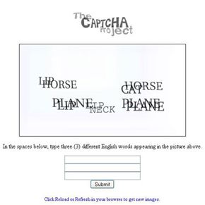 What about more complex CAPTCHAs? The Gimpy CAPTCHA displays 10 English words with warped fonts across an irregular background. The CAPTCHA arranges the words in pairs and the words of each pair overlap one another. Users have to type in three correct words in order to move forward. How reliable is this approach?